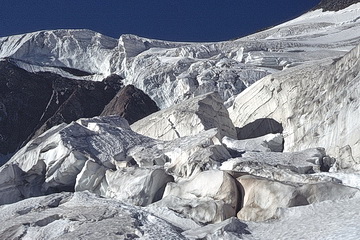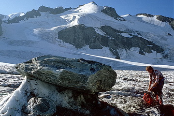 'Glacier table' in front of the Petite Ciamarella (3520 m) - to the left Grande Ciamarella (3676 m). The further ascent leads diagonally from the left across the icy hump and the upper part of the glacier to the Albaron saddle at 3474 m.