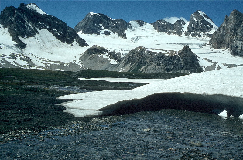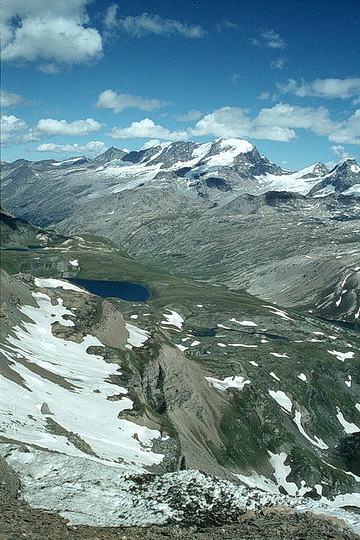 The snow and debris covered slopes in the center of the picture mark the path from the Goletta lake (right outside the picture) to the Bassac Dere pass (2984 m). Behind to the right Grande Traversiere (3596 m).