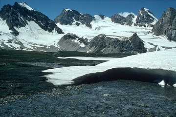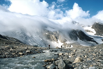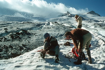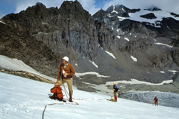The Nivoletta Pass and Punta Basei were our first tour with a nice view towards the western flank of Gran Paradiso. Punta di Galisia - our next goal - is situated about 2 km south of Punta Basei. The northern ascent is an easy glacier hike whereas its walls are breaking down abruptly to the southeast. Another aim could be the north face of Tsanteleina which we didn't do because of the unsettled weather. Alternatively we climbed Becca della Traversiera via the Goletta Glacier which at this time still calved into the Goletta Lake. This summit can also be reached from the Bassac Dere pass which we used for the descent.