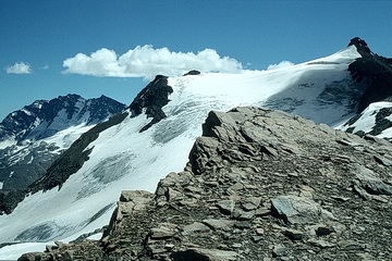 Der Aufstieg erfolgt auf dem Golettagletscher über einige Spalten (links). Man erreicht den Gipfel auch seilfrei über den Nordgrat vom Colle Basac Dere (2984 m) ganz rechts. Dies ist auch der Übergang zur Bezzihütte.
