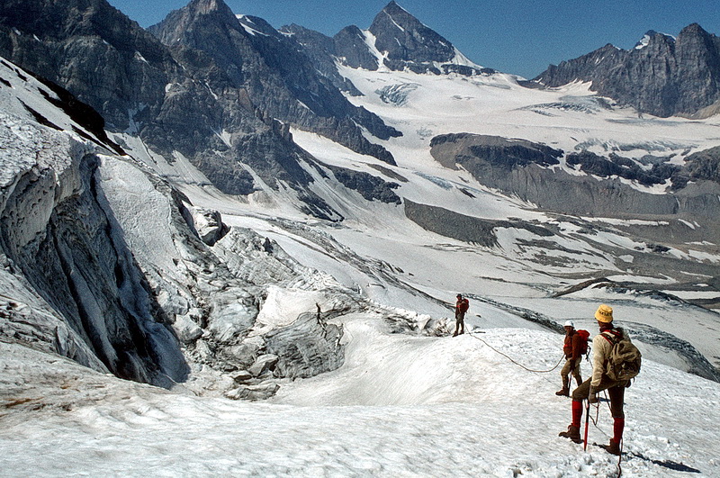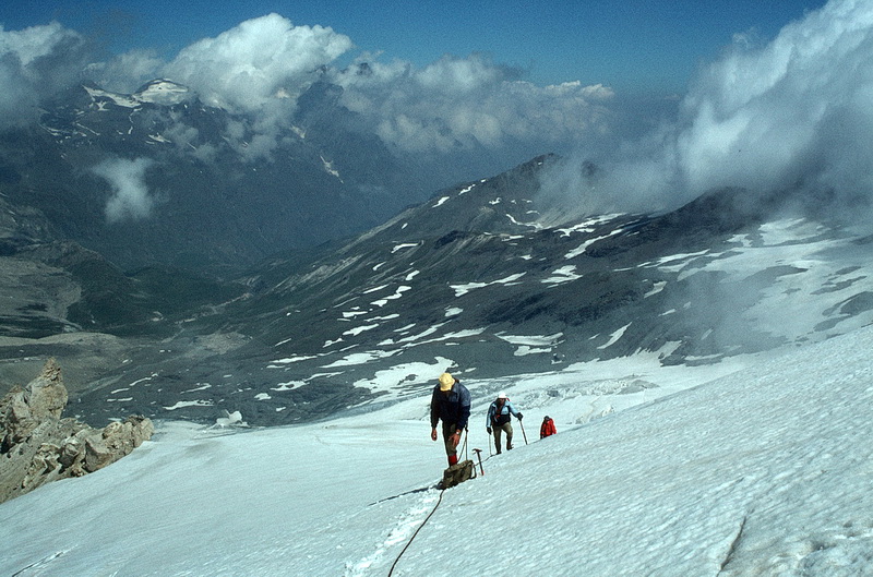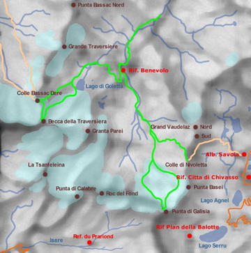 Zum Colle di Nivoletta und der Punta Basei führt auch unsere erste Tour, mit schönen Blick zur Westseite des Gran Paradiso. Etwa 2 km südlich der Punta Basei liegt unser nächstes Ziel, die Punta di Galisia, die von dieser Seite eine leichte Gletschertour darstellt, deren Wände aber jäh nach Südosten abbrechen. Ein weiteres Ziel wäre die Nordflanke der Tsanteleina, hier war uns allerdings das Wetter zu unsicher. Alternativ dazu bestiegen wir die Becca della Traversiera über den Golettagletscher, der damals noch in den Lago di Goletta kalbte. Vom Col de Bassac Dere führt ebenfalls ein Weg auf diesen Gipfel, den wir im Abstieg benutzten.