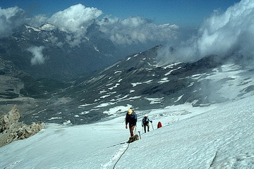 The ascent of Punta di Galisia requires glacier equipment because of possible crevasses. Apart from that there are no further difficulties. Punta di Galisia is an easy glacial summit with a steeper slope just below the summit ice field - also recommendable as ski-tour.