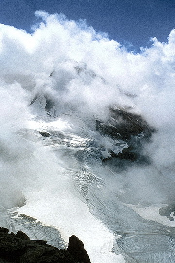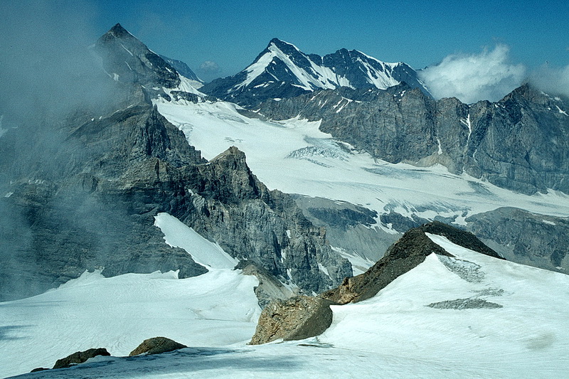 One of the few clear moments: Tsanteleina (3605 m) and Aiguille de la Grande Sassiere (3751 m).