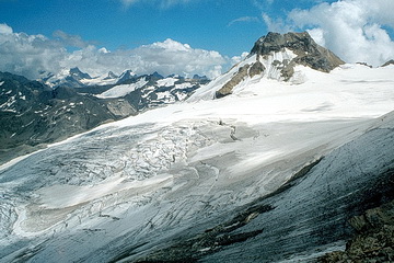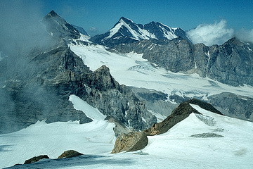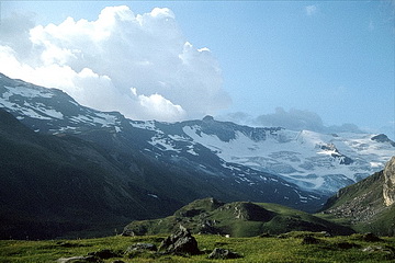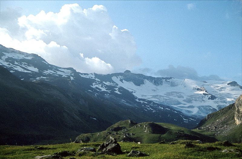 The Goletta Glacier seen from the north ridge of Becca della Traversiera. Behind Gran Paradiso (4061 m), La Tresenta (3609 m) and Ciarforon (3642 m), right of the center Granta Parei (3387 m).