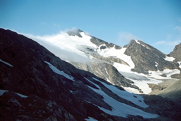 We used the ascent via the Goletta Glacier (to the left) but the summit can also be climbed without rope from the Bassac Dere Pass (2984 m - right) on its northern ridge. This is also the traverse to the the Bezzi Hut.