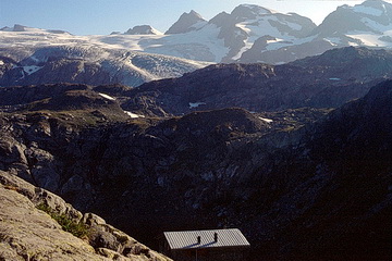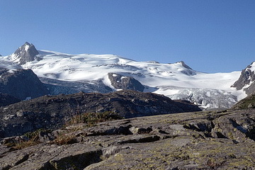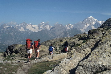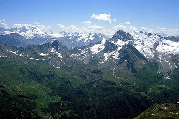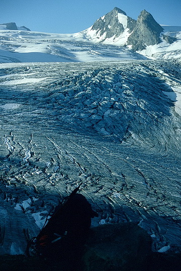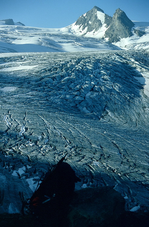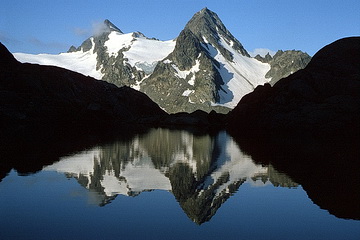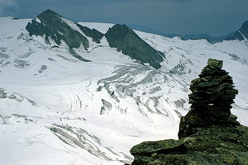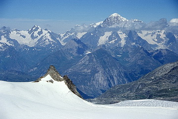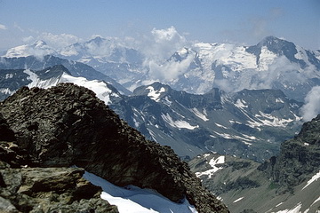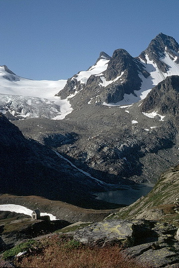 Testa del Rutor is the highest point of a glacial area between Mont Blanc and Grand Paradiso. Between Courmayeur and 'Kleiner St. Bernhard' pass we follow a small road in direction La Joux. Starting at an altitude of 1624 m it takes about 2.5 hours to reach the Deffeyes Hut. Along the way there are footpaths leading to 3 different cascades which are worth to be seen. The first part of the ascent route takes us through broken rocks and debris onto the gently rising glacier leading to the Rutor Pass (3373 m). This pass is also the traverse to the Val Grisanche and the Scavarda hut from where Rutor can be climbed in about 3 hours with only a minimal glacier crossing. From this pass a flat ridge covered with debris and rocks leads to the summit (4.5 hours from the Deffeyes Hut).