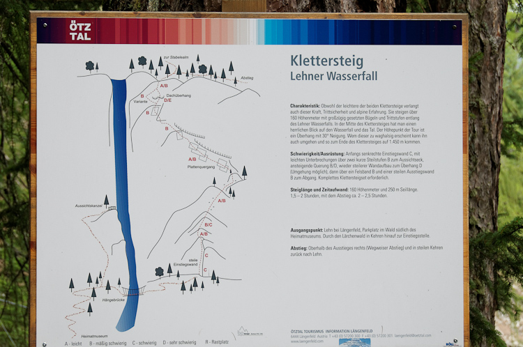 Der Lehner Wasserfall bei Längenfeld im Ötztal ist an sich schon einen Ausflug wert. Wer jedoch gerne etwas schwierigere Anstiege benützt, kommt hier ebenfalls auf seine Kosten. Ein Klettersteig mit Überhang führt direkt zum oberen Ende des Wasserfalls und sollte nur von geübten Klettersteiggehern begangen werden.