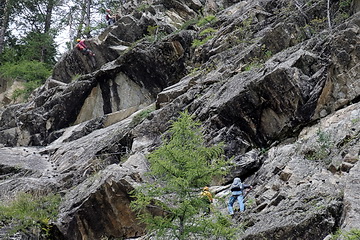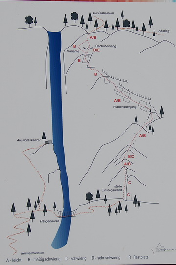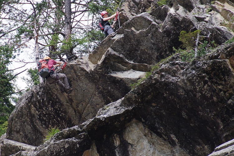 Von hier aus läßt sich auch der Klettersteig beobachten, der sich auf der rechten Seite des Wasserfalls hinaufzieht.