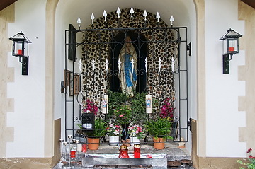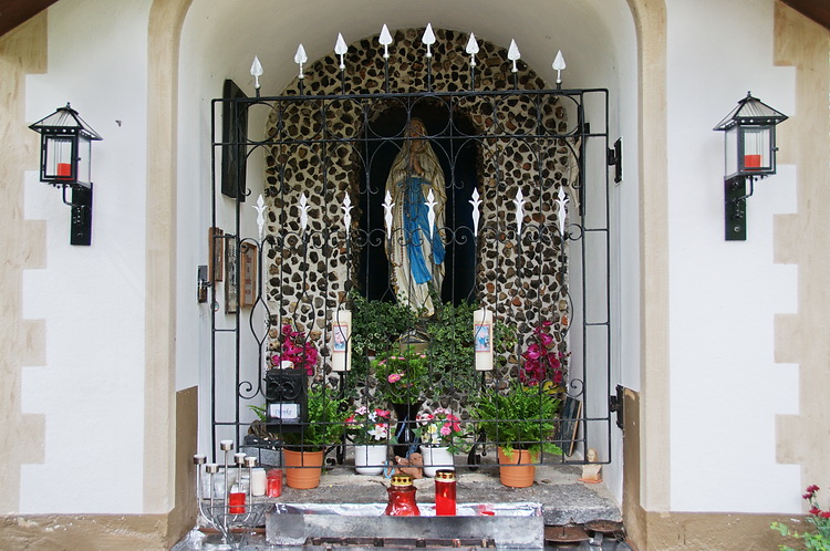 Mit einem Kreuzweg beginnt der erste Teil des Anstiegs zur Hängebrücke, von wo man das Ziel bereits erkennen kann. Kurze Zeit später erreicht man den Aussichtsplatz unterhalb des Wasserfalls.
