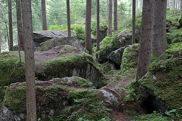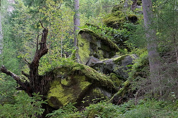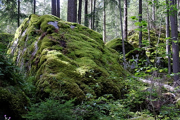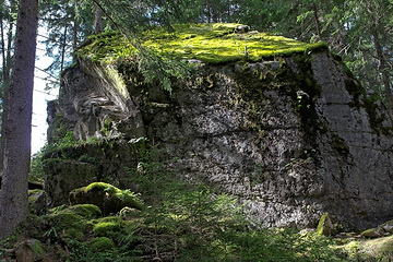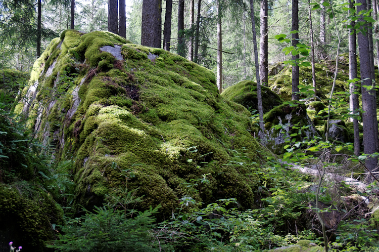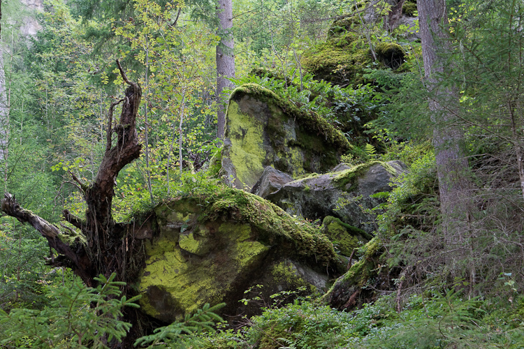 Am südseitigen Ufer des Sees findet man auch die Überreste des Felssturzes. Die riesigen Felsblöcke sind dicht mit Moosen und Farnen bedeckt und geben dem Wald eine ganz besondere Note.