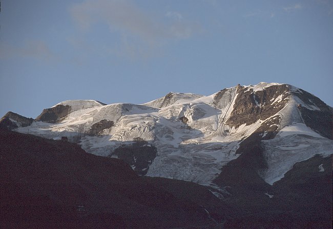Early morning panorama from Sulden with Sulden Spitze (3375 m), Schrötterhorn and Kreilspitze as well as Königsspitze and Hintergrat Hut.