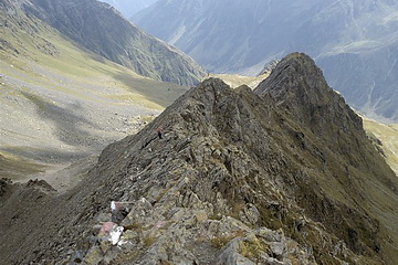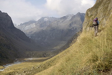 The first part of the Stubai Hike leads from Starkenburger Hut to the mostly 'fairly crowded' Franz Senn Hut from where several summits can be climbed. On top of Schafgrübler, a rather lonesome peak of almost 3000m, one gets a first impression of the surrounding glaciers. The optimum panorama is however obtained at the summit of Rinnenspitze (3000m). The upper part of the ascent is belayed by wire cables an iron pins and a few exposed parts afford caution, alpine experience and a good head for heights (2.5 hours from the hut).
