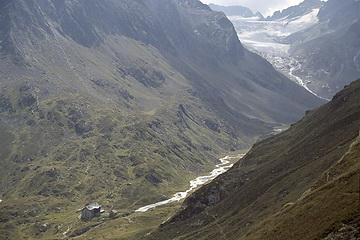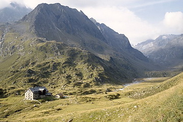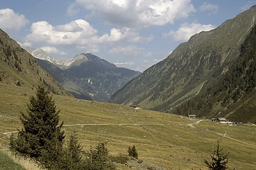 The Franz Senn Hut can also be reached from the parking lot at the Oberissalm (about 400m of altitude below the hut). In the background Hoher Burgstall where Starkenburger Hut is situated at the right end of the ridge. To the right the Franz Senn Hut, starting point for the hikes to Schafgrübler and Rinnenspitze.