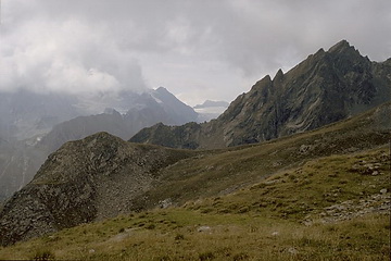 During the ascent most of the peaks were still covered in clouds.It was not until below the summit (which is however hidden behind the ridge) that the clouds disappeared. The path leads to the gap right of the center and continues to the left across the ridge.