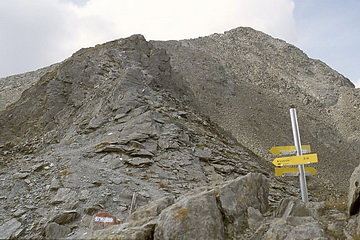An der Scharte zweigt der gut markierte aber zum Teil weglose Anstieg zum Gipfel ab (20 Minuten).