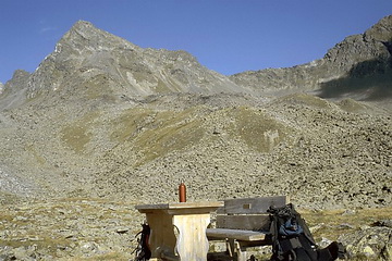 Just behind the Franz Senn Hut the path to Rinnenspitze turns west. About halfway up we found this nice place which is dedicated to an english alpinist.