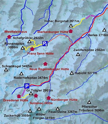 The Dresdner Hut at the foot of the Stubai Ski Resort is the starting point for the ascent of Grosser Trögler which can also be used as a traverse to the Sulzenau Hut. The descent to Sulzenau Hut is a little bit tricky as some grass slopes and a few exposed parts have to be crossed which affords caution. The summit panorama is excellent and shows the Zillertal Alps, the glaciers around Zuckerhütl and Wilder Freiger up to Ruderhofspitze to the north.