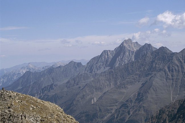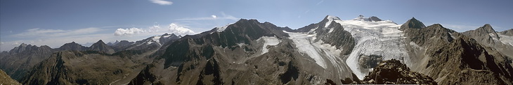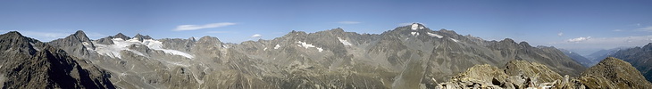Das Gipfelpanorama nach Westen zu Stubaier Wildspitze (3340m), Wilder Leck (3361m) und Ruderhofspitze (3474m).