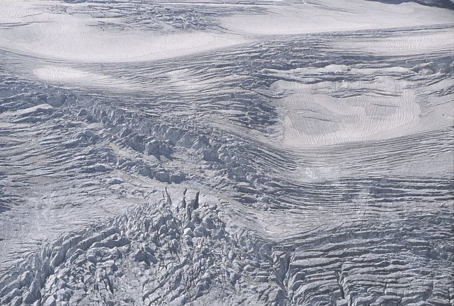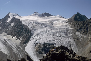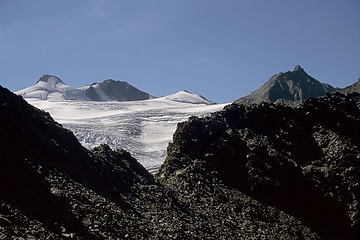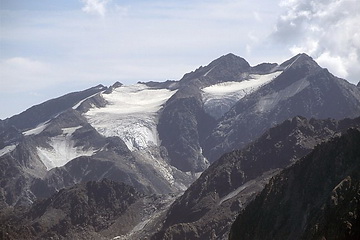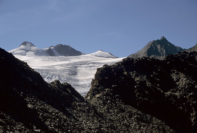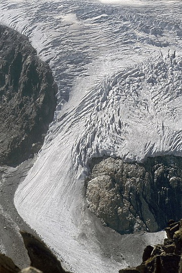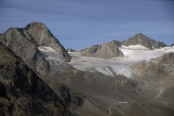 The glacier which years ago ended in a second icefall above the Sulzenau Hut is now gently running out already below the first one.