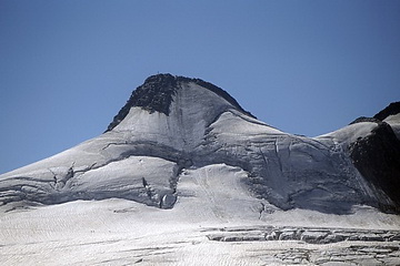 The remainders of the Sulzenau Glacier. The rock island in the lower part of the picture has opened about 6 years ago and is symptomatic for the rapid retreat of this glacier. Likewise were the conditions at the summit of Zuckerhütl.
