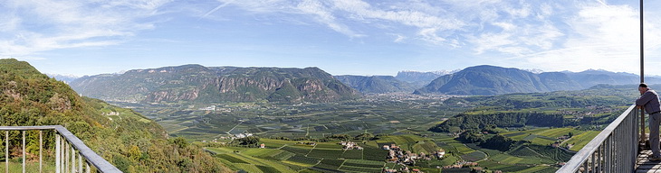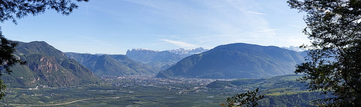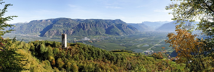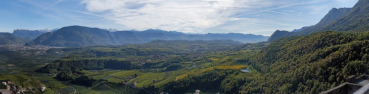 First class views along the 'Three Castles Walk': The panorama starts with the pyramid of 'Kleiner Ilfinger' near Meran followed by foothills of the Sarntal mountains up to the Dolomites.