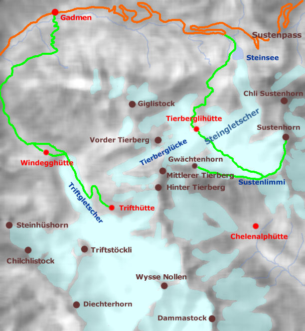 Ein Weg nach Gadmen, unserem Ausgangsort, führt über den Sustenpass mit seinem bekannten Ausblick auf Steingletscher, Steinsee und den Ostgrat des Wendenhorns (3023 m).