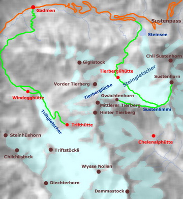 In arktischer Umgebung liegt die Trifthütte (2520 m), welche entweder von Gadmen an der Sustenpassstrasse, vom Hotel Belvedere über den Rhonegletscher oder von der Gelmerhütte aus erreicht werden kann. Der von uns gewählte Aufstieg von Gadmen (1205 m) führt vorbei an der Windegghütte des SAC (1887m). Auf ca. 1900 m führte im Jahre 1985 noch ein mit Eisenleitern gesicherter Abstieg hinab zum Triftgletscher, den man in südöstlicher Richtung überquerte. Die Gletscherzunge löst sich allerdings nach Auskunft von Glaziologen der ETH Zürich seit einigen Jahren in einen neu entstandenen Gletschersee auf. Auch die von uns noch fotografierten Gletscherwellen sind inzwischen historisch und existieren nicht mehr. Danach steigt man anfangs mühsam über die Seitenmoräne des Triftgletsches, wobei der Weg in Richtung Hütte immer besser wird.