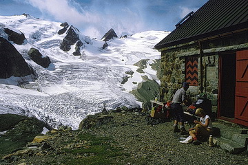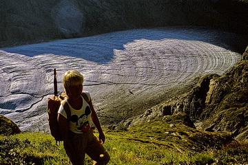 The Trift hut (2520 m) is embedded in a real arctic environment and can be reached either from the village of Gadmen at the Sustenpass road, from Hotel Belevedere across the Rhone Glacier or from the Gelmer Hut.The ascent we choose starts at Gadmen (1205 m) and passes the Windegg Hut (1887 m) about half way up. Further up at approximately 1900 m iron ladders lead down to the Trift Glacier which has to be crossed in south-eastern direction. At least in 1985 this was the case as - according to scientists of the Zurich University - the tongue of this Glacier is slowly melting away and now forms a lake instead. The wave-like Glacier tongue as can be seen in the photos below does not exist anymore. After crossing the Glacier the side moraine is entered which is a bit arduous at first but soon the path is improving.