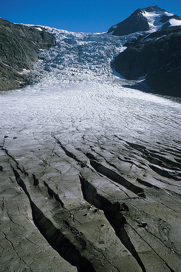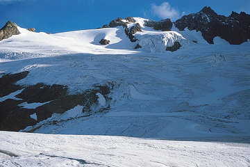 This photo shows the arctic dimensions of the Trift Glacier. Behind the summit of Tieralplistock (3383 m), to the right Diechterhorn (3389 m). The Trift Glacier is about 7 km long and up to 4 km wide. Beyond the gap to the left the Rhone Glacier (10 km) is situated.
