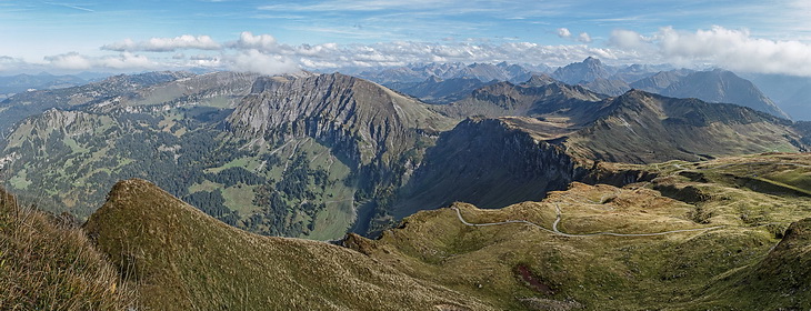 Being on vacation in the Bregenzerwald region does not necessarily mean you are hiking in the mountain range of the same name. Diedamskopf for example is part of the Allgäu Alps even if not many people would expect it to be there. Like many other mountains in this area it is a well known ski resort with a cableway leading up to 70 m below the summit. There are however some nice hiking trails between the summit and the middle station like for example the 'Plateau Circle Hike' which all have one thing in common: an excellent view.