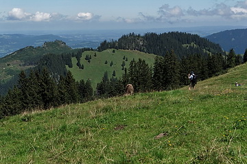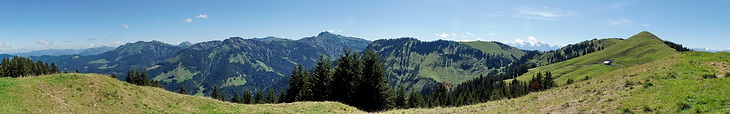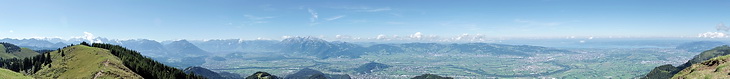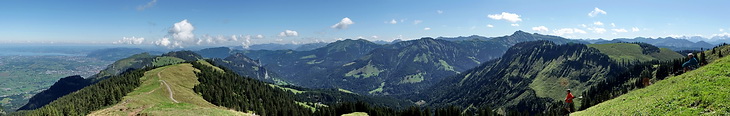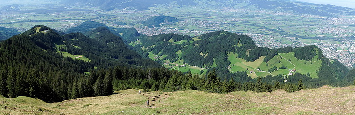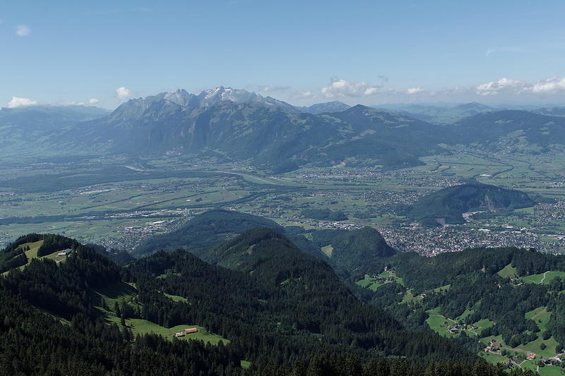 It takes at least two hours to climb the 600 meters of altitude from the village of Ebnit to the summit of Hohe Kugel (1645 m) a nice panorama peak high above the Rhine Valley. As one can expect from a ball (= Kugel) the view is free in all directions including the Allgäu and Bregenzerwald mountains, Silvretta, Montafon and finally Tödi and Säntis in Switzerland.