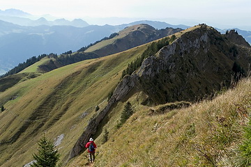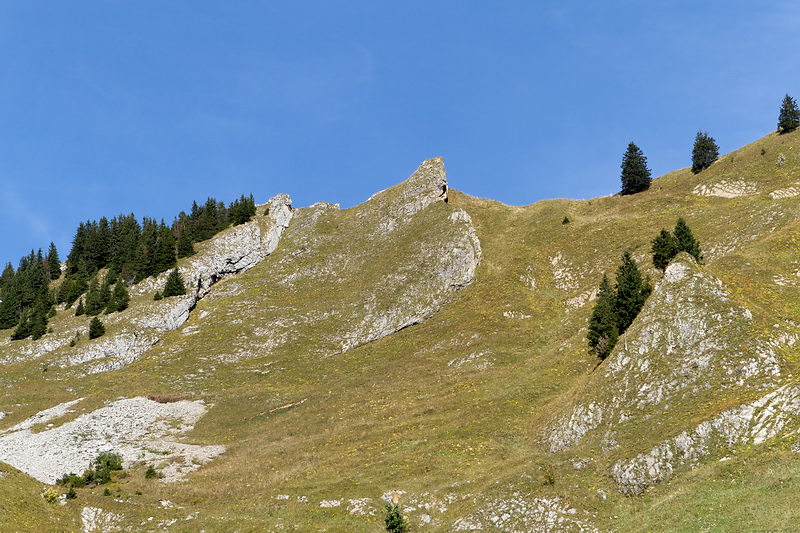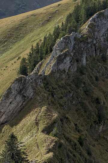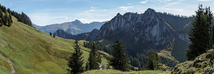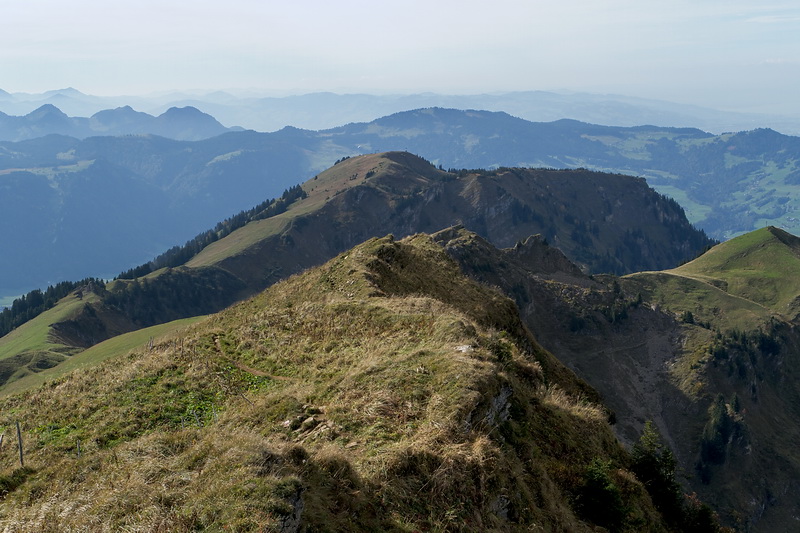 The first part of the ascent was moderately steep and easy-going until we reached an alpine pasture called Lingenauer Alpe where the path steepened for the final 300 vertical metres. In the left picture we can see the rocky part of the ridge called Hasenstrick which we had to cross on the way back.