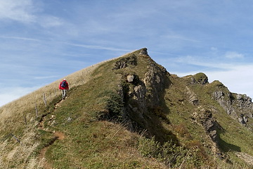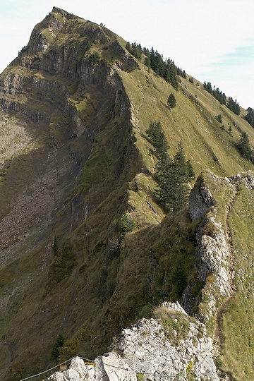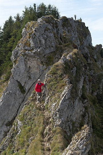 'For experienced hikers only' is written on the sign at the beginning of the so-called 'Hasenstick', a rocky part of the ridge which affords caution - especially in wet conditions - and which is belayed by a wire rope.