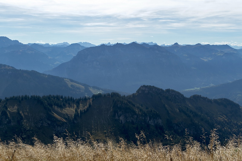 From the summit of Kanisfluh we could oversee the entire ridge from the intermediate station of the cableway (near the landslide in the left part of the picture) to the summit of Winterstaude in the center.