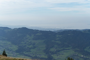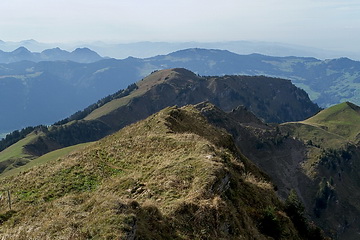 Last but not least Lake Constance in direction of the long ridge back across the 'Niedere' ridge up to the cableway station on the left below the summit.