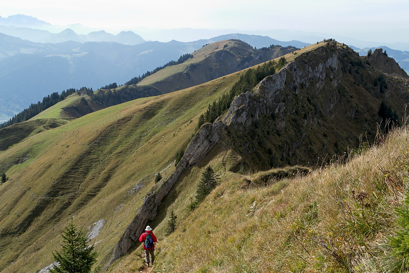 Bis zur Lingenauer Alpe direkt unterhalb des Gipfels steigt der Weg gemächlich an, danach geht es noch einmal 300 Höhenmeter steil bergauf. Links das 'Hasenstrick' genannte felsige Gratstück, das wir auf dem Rückweg überquerten.