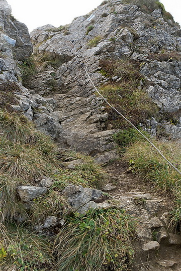 'Nur für Geübte' ist der sogenannte 'Hasenstrick'. Das kurze, felsige Gratstück erfordert Trittsicherheit, besonders bei Nässe, ist aber mit einem Drahtseil gesichert.