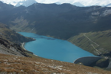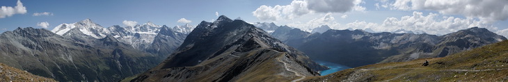 Sorebois is a nice panorama summit situated between the Moiry Lake and the village of Zinal in the Anniviers Valley. You can either use the cableway from Zinal up to 400 m below the summit and follow the skilifts or you start the ascent at Lac de Moiry which is twice as long but in a much nicer scenery. From Bishorn to the left up to Grand Combin quite a few 4000m peaks are visible. The only one missing is Matterhorn which we finally discovered on our way down to Zinal.