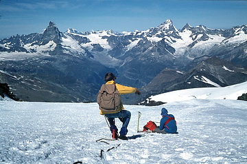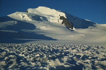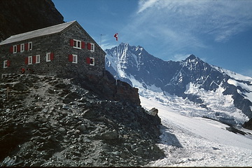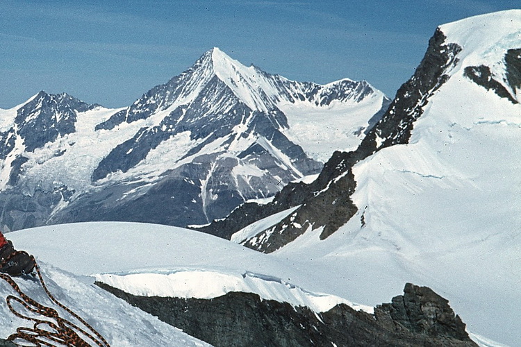 The Mischabel group seen from the Britannia Hut. Left to right: Täschhorn (4491 m) - Dom (4545 m) - Nadelhorn (4327 m) - Lenzspitze (4294 m).