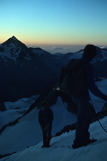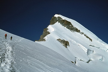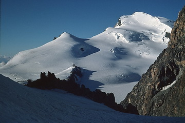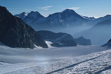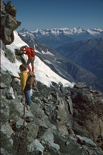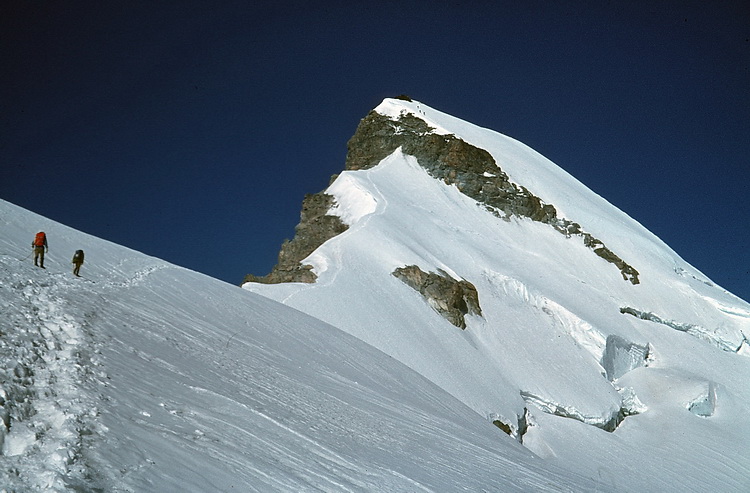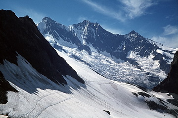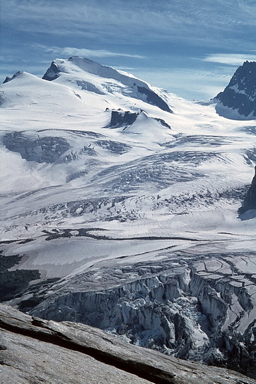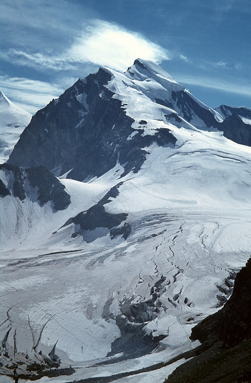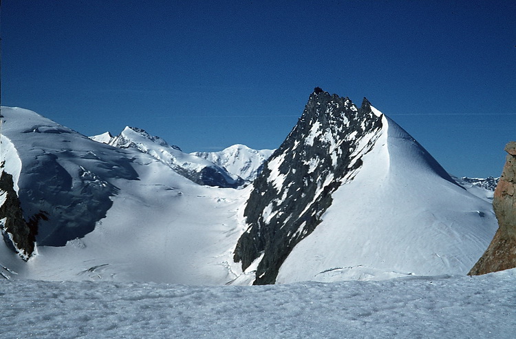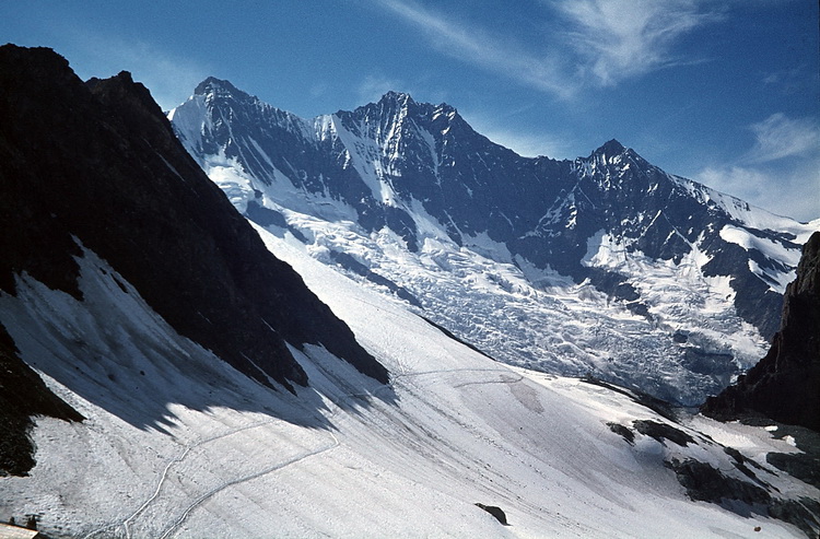 Fluchthorn (3790 m) und Strahlhorn (4190 m) vom oberen Teil des Hohlaubgrats aus gesehen. Die Spur führte damals (1979) immer am Grat entlang und über den Felsriegel zum Gipfel. Fluchthorn (3790 m) and Strahlhorn (4190 m) seen from the upper part of the Hohlaub Ridge. The track was always following the ridge (in 1979) passing the rock band on debris, snow and ice. |