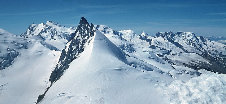 The panorama from the summit of Allalinhorn: the east face of Monte Rosa, Rimpfischhorn (4199 m), Lyskamm (4527 m), Castor (4228 m), Pollux (4092 m) and finally Breithorn (4164 m).