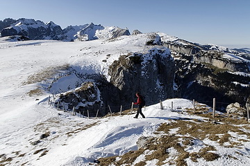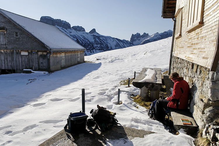 One of the southern ascent routes starts at Plattenbödeli (the white spot above Lake Sämtis) and leads straight up to the huts of Alp Sigel. One day before Christmas things are very quiet there.