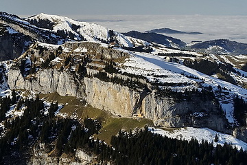 Bergstation und Gasthaus auf der Ebenalp. Unterhalb der Felswand führt der Weg vorbei am Gasthaus Äscher zur Wildkirchli Höhle, die im rechten, schattigen Teil der Felswand liegt (hinter den Schneeflecken). Rechts die unter Kletterern gut bekannten Altenalptürme.