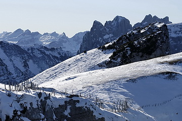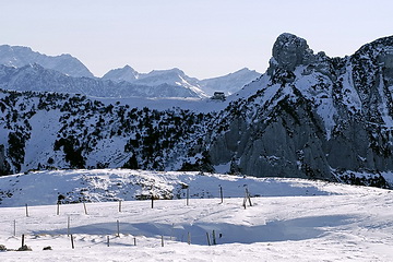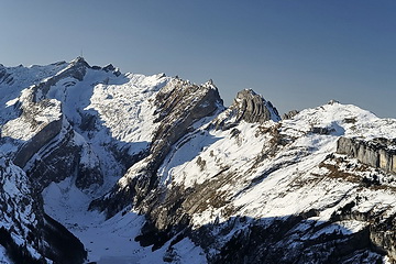 The snow-covered plateau with Säntis and the northern chain of the Alpstein Massif. Säntis, Öhrli, Altenalptürme and Schäfler.