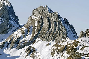 The top station of the Ebenalp cableway. Below the rock wall the footpath passes the Aescher restaurant and leads to the Wildkirchli cave situated in the shady part of the wall behind the snow patches. The right picture shows the Altenalp Towers which are well known to rock climbers.