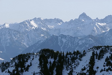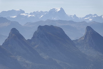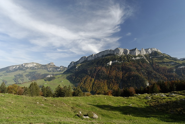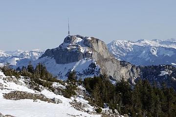 The panorama on the top of Joechli is really impressive. Behind Wildhuser Schafberg we can see Churfirsten and Tödi. Due to the autumnal season Zurich Lake is covered with mist (right). The telephoto shows Zuestollen, Brisi and Frümsel, three out of 7 summits of the Churfirsten massif. The ice-covered mountains in the background are Bifertenstock and Tödi.