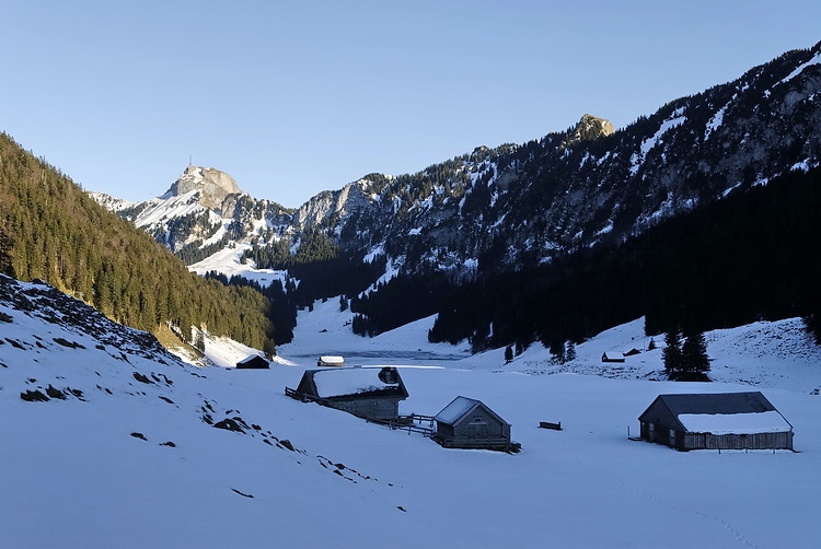 Einer der möglichen Südanstiege führt vom Gasthaus Plattenbödeli (dem hellen Punkt oberhalb des Sämtiser Sees) direkt hinauf zu den Almhütten der Alp Sigel. Einen Tag vor Weihnachten ging es hier recht beschaulich zu.