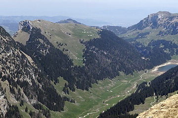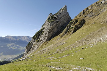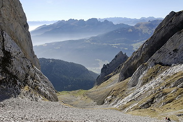 The plateau of Alp Sigel seen from Hoher Kasten. The northern ascent is a bit more difficult and leads through a couloir belayed by wire cables which is called 'Zahme Gocht'.