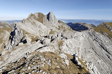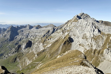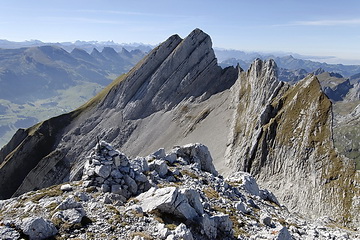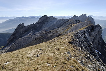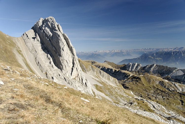 The interesting profile of the Schafberg Wall in western direction. Grassy slopes lead to the Joechli gap. Wildhauser Schafboden and Schafberg Wall are now 600 m below. The panorama starts with the Bernina Range in the background left, followed by Alvier, Fulfirst and Gamsberg in the center. The rightmost peaks are Ringelspitz and Piz Sardona.