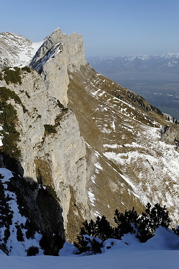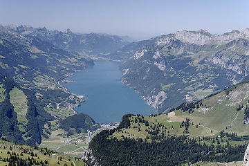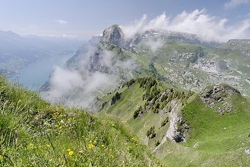 In eastern direction the precipitous walls of Gamsberg (center) and Sichelchamm. The southern faces of Gamsberg and Sichelchamm are breaking off in steps down to Lake Walensee.